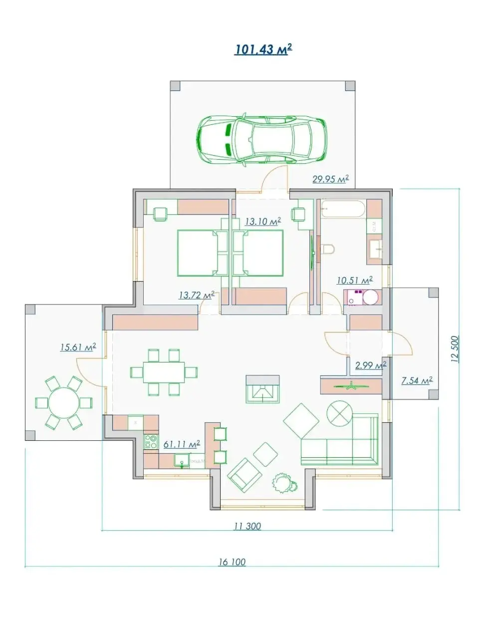 Площадь - 100м2 Фасад - кирпич с декоративными элементами Кухня - гостинная Спальня 2шт. Мастер-Спальня 1шт. Санузел - 2шт Гардероб Котельная Терраса